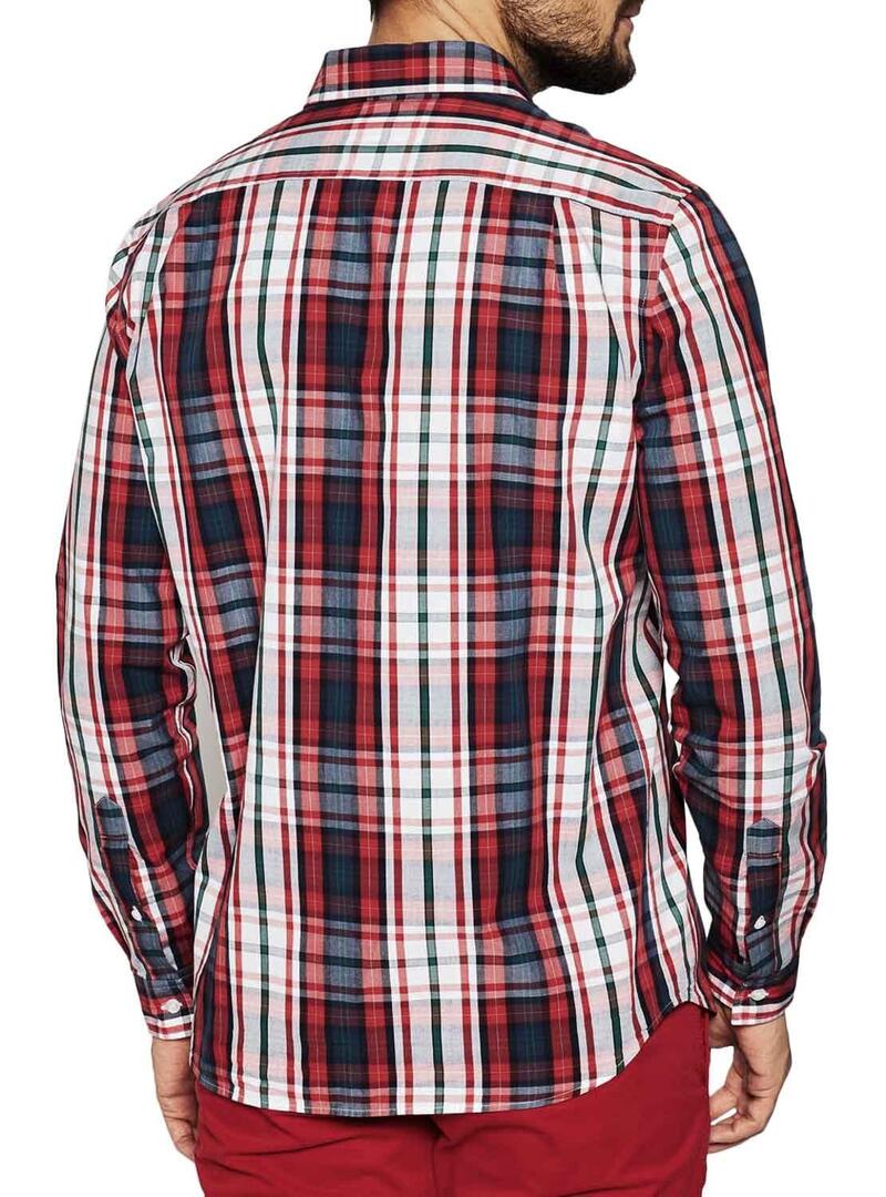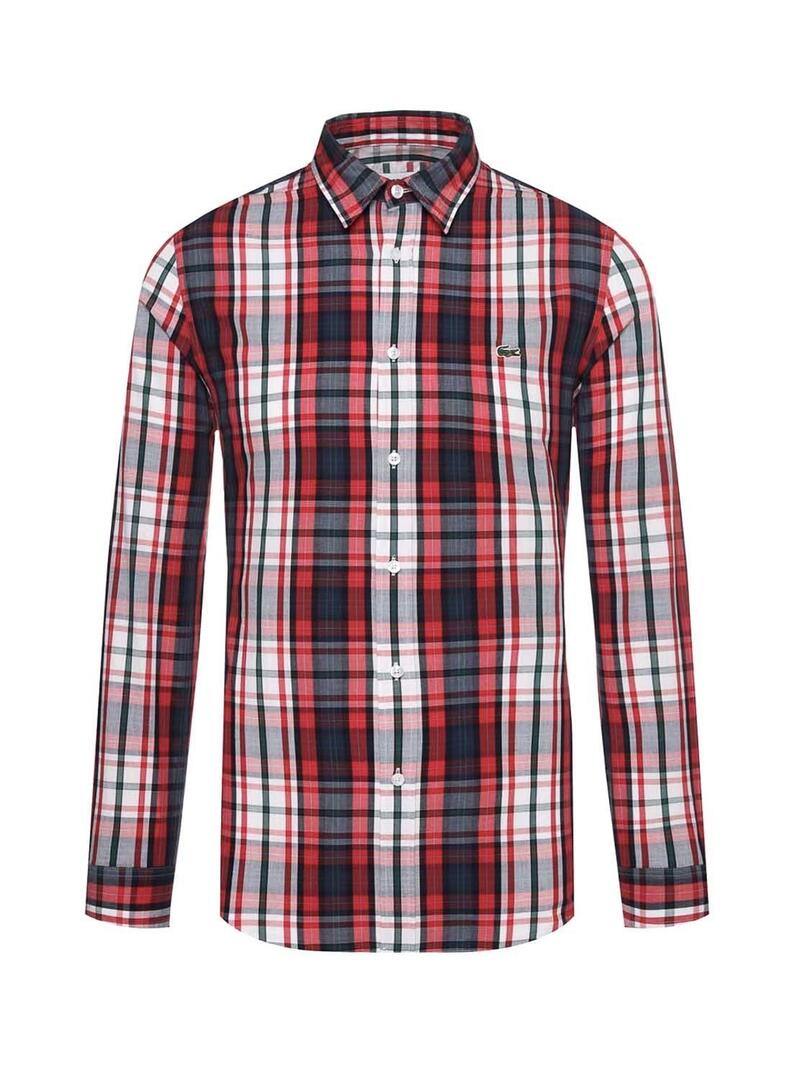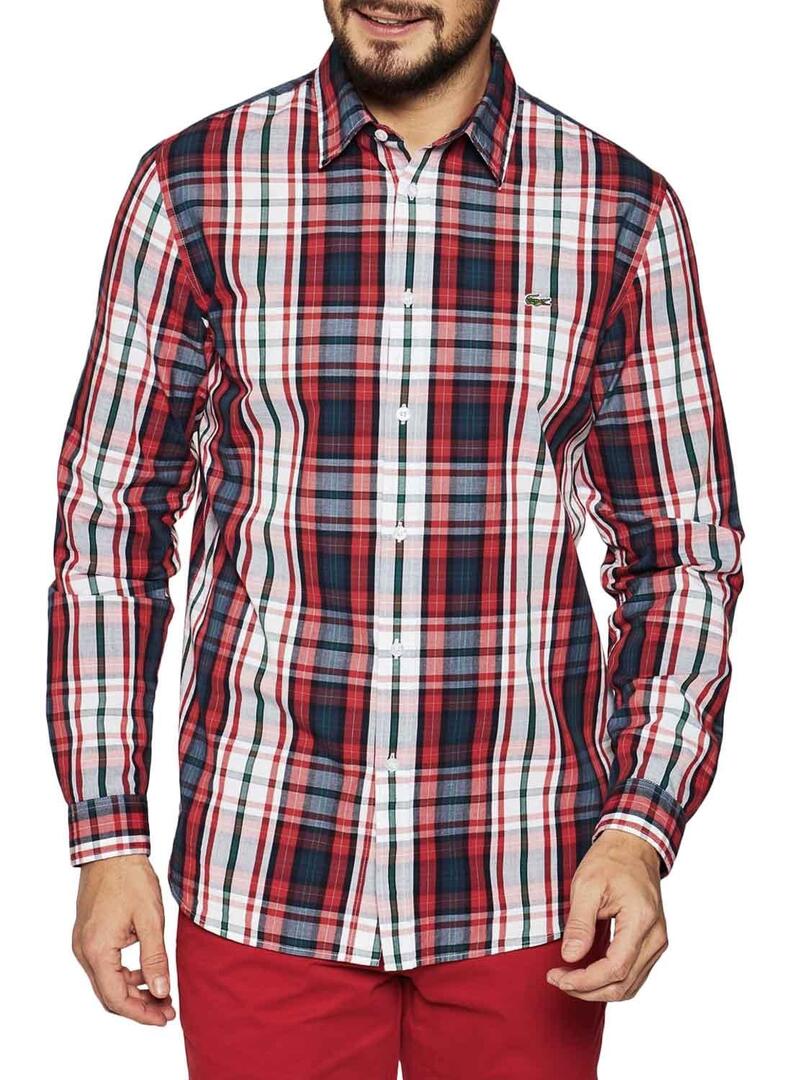 Camicia Lacoste. Modello con motivo geometrico a quadri. Colorazione rossa, blu navy e bianca. Chiusura con bottoni. Regular fit Logo emblematico ricamato sul petto. Orlo arrotondato.