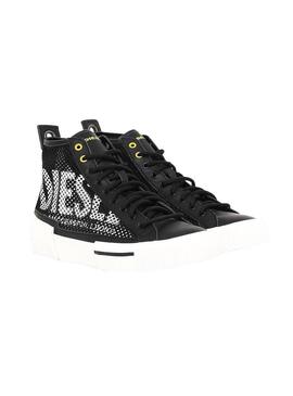 Sneaker Diesel. Modello Dese. Colore nero. Suola gomma. Pannelli in vacchetta. Pannelli laterali in rete con logo stampato. Canna media. Chiusura con lacci.
