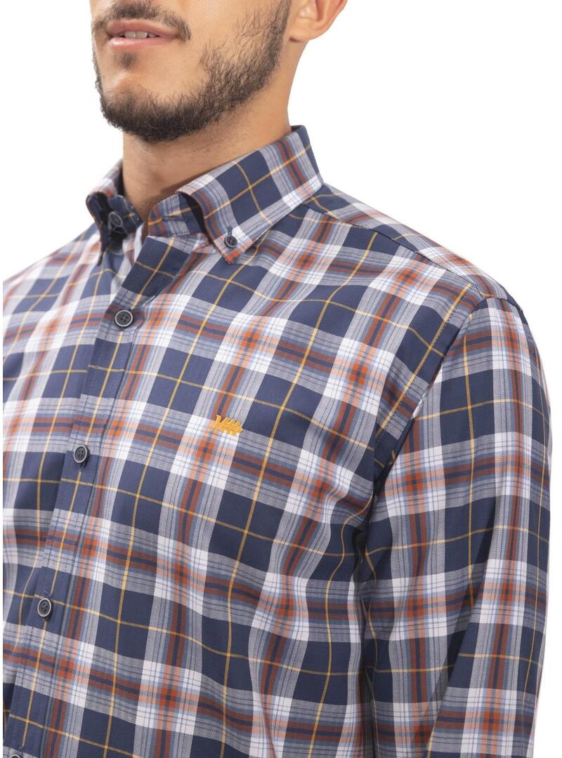 Camicia Klout. Modello Pandora. Stampa a scacchi blu e arancione. Regular fit Logo ricamato sul petto. Chiusura con bottoni. Il modello è alto 1,85 e indossa una taglia M. La maglia è prodotta in Spagna.