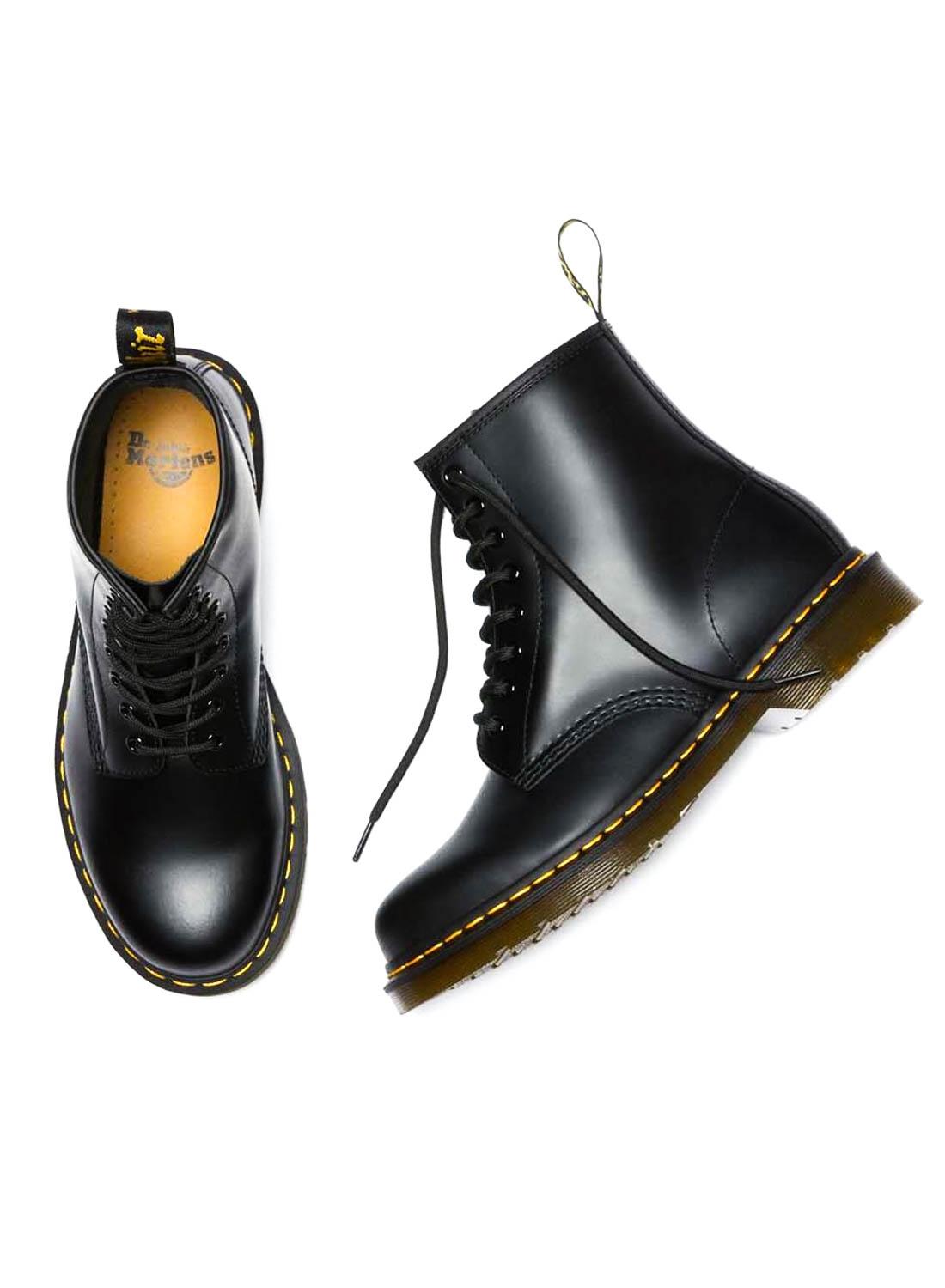Stivales Dr. Martens. Marchio originale Stivale. Modello 1460 Liscio. Realizzato in morbida pelle. 8 gommini. Colore nero. Scanalature laterali. Suola antiabrasione e antiscivolo. Con camera d'aria. Cuciture gialle.