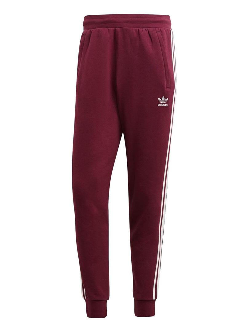Pantaloni Adidas. Modello Adicolor Classics 3Stripes. Colore granato. Strisce laterali in bianco. Polsini e vita elasticizzati. Tasche laterali. Il modello è alto 1,88 m e indossa una taglia M.