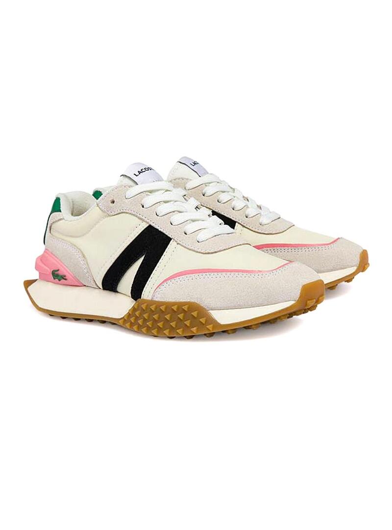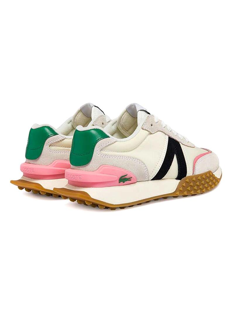 Sneaker Lacoste. Modello L Spin Deluxe. Beige. Chiusura con lacci. Pannelli e dettagli nei colori rosa, verde e nero. gomma e suola in EVA. Fodera in tessuto. Coccodrillo sul tallone. Etichetta sulla linguetta cucita.