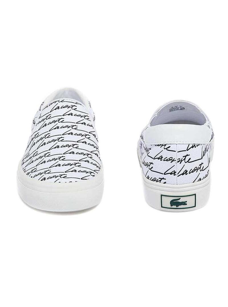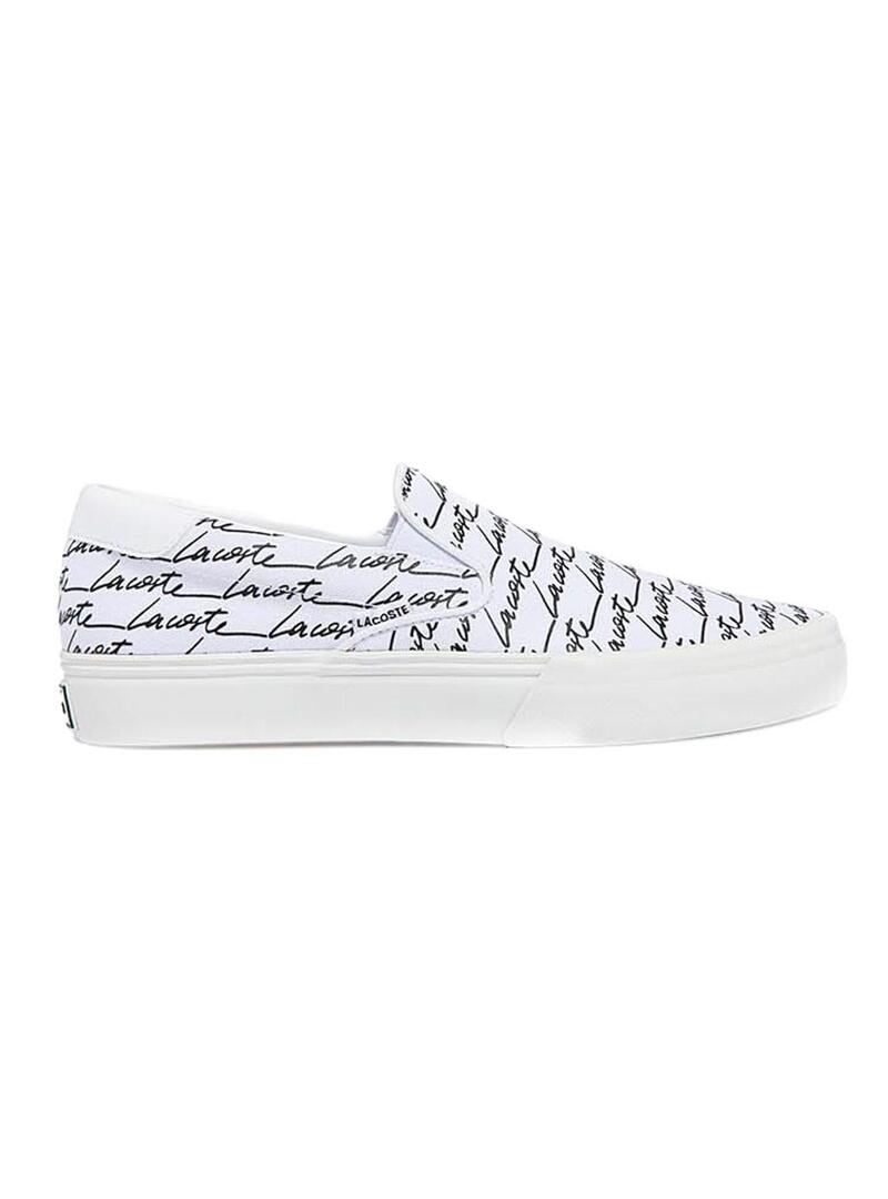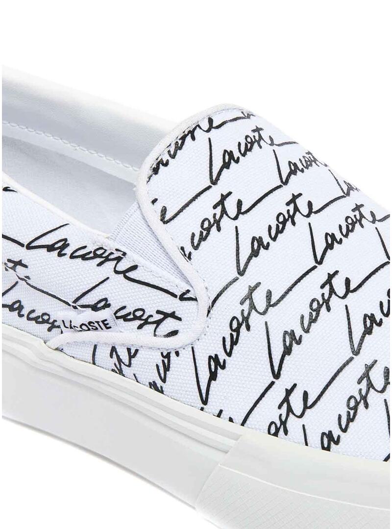 Sneaker Lacoste. Modello Jump Serve Slip. Colore bianco. Niente lacci. Suola gomma. Marchio lungo la scarpa in nero. Tessuto in tela traspirante.