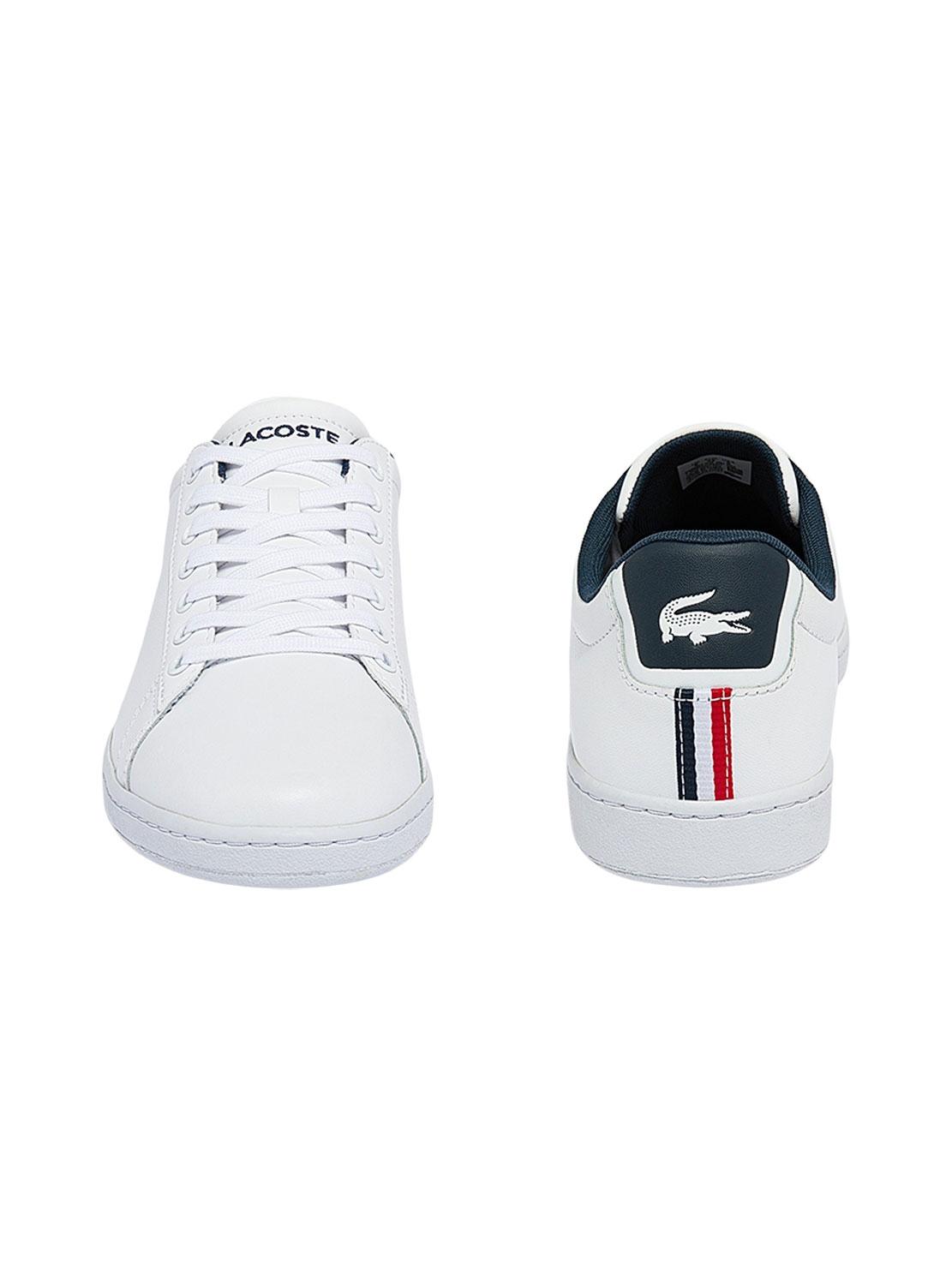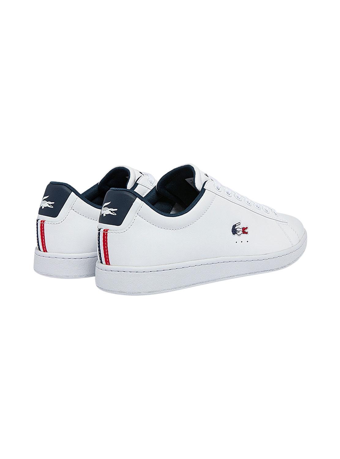 Sneaker Lacoste. Modello Carnaby Evo. Colore bianco. Chiusura con lacci. Coccodrillo ricamato sul lato con bandiera. Suola gomma. Fascia tricolore sul tallone. Lettere sulla lingua.