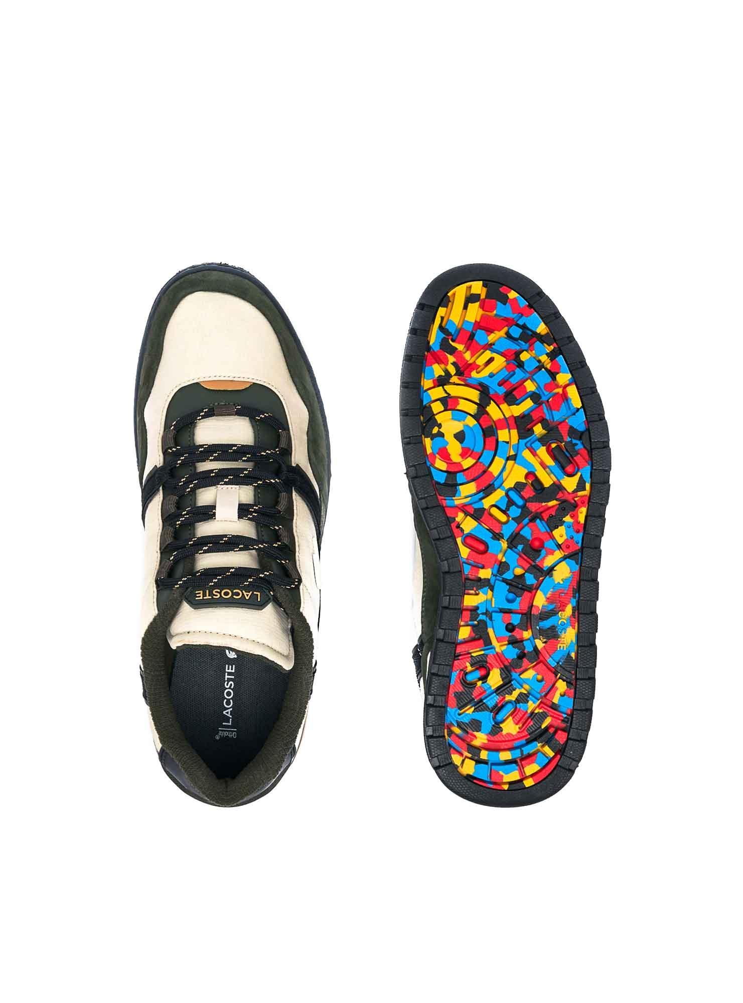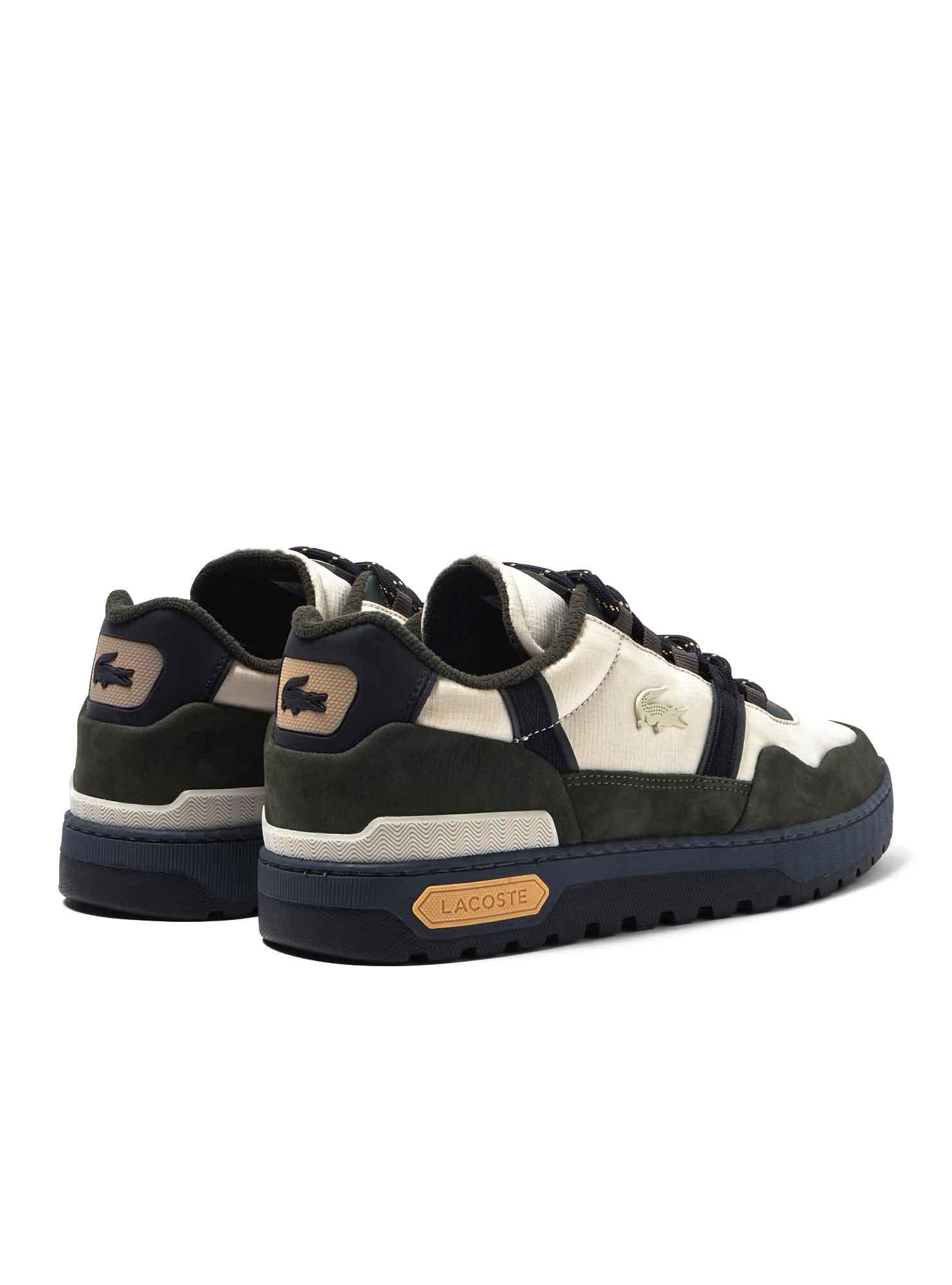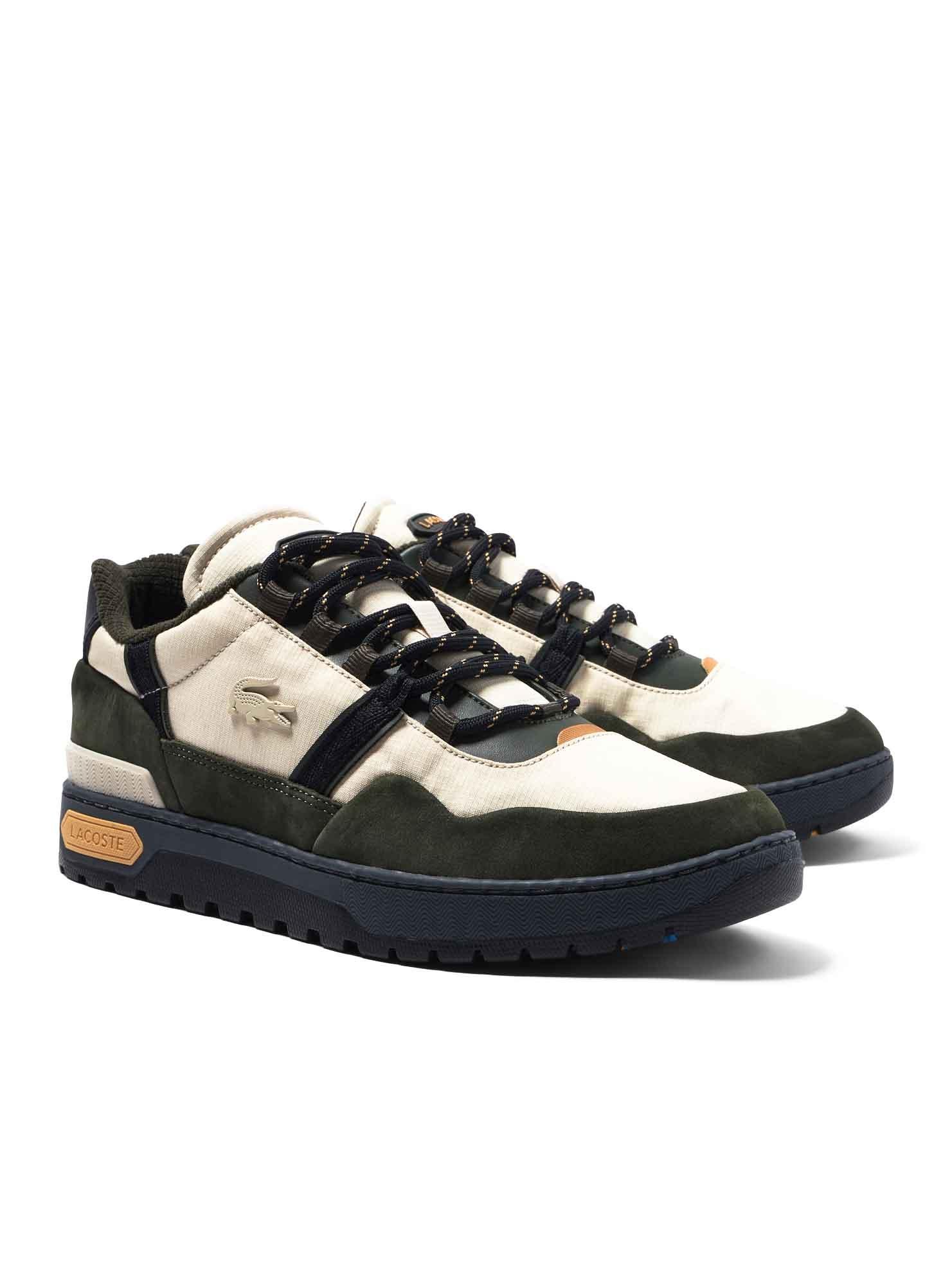 Sneakers Lacoste per uomo. Modello T-Clip. Colore nero e beige. Dettagli in arancione e blu navy. Crocodile beige sul lato. Chiusura con lacci. Crocodile sul tallone.