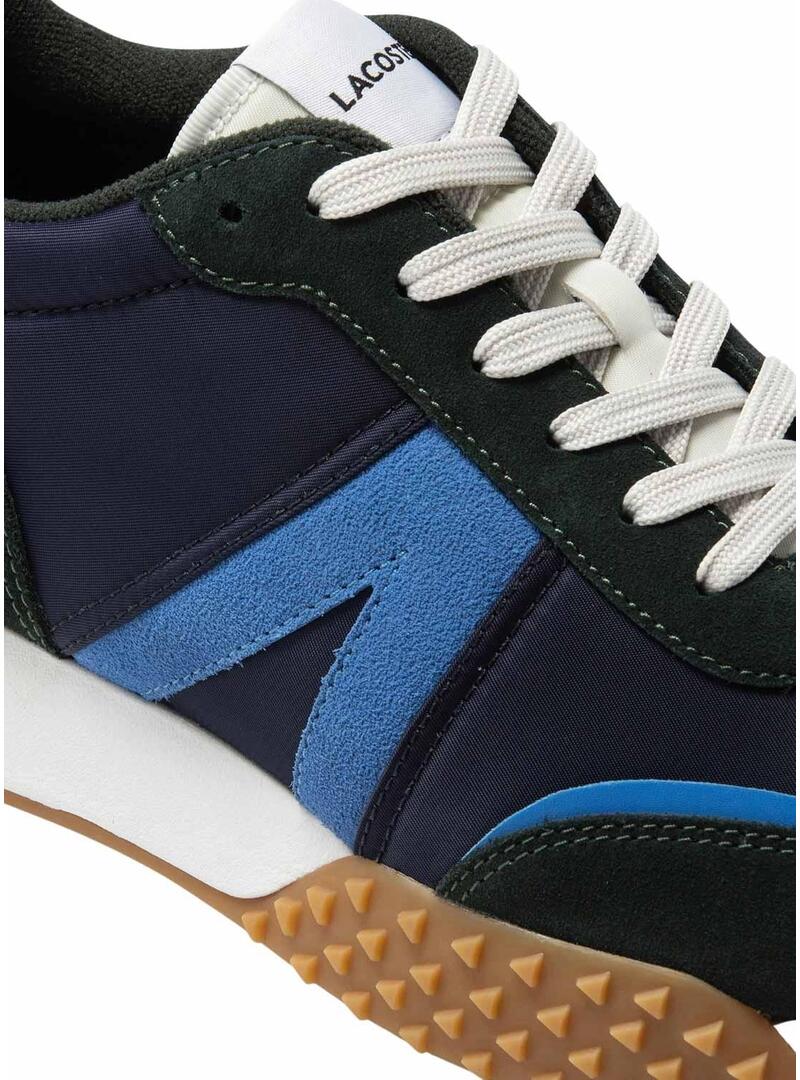 Sneakers Lacoste. Colore blu navy. Modello L-Spin Deluxe. Colore blu, navy e verde. Stabilizzatore del tallone. Chiusura con lacci. Fodera in tessuto. Coccodrillo metallico. Nylon Parte superiore. Pannelli in pelle. design d'avanguardia. Suola spessa.
