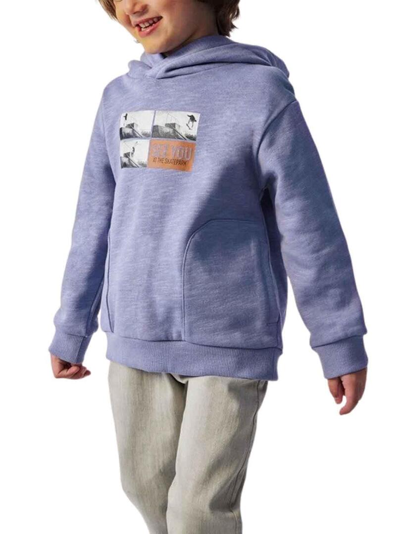 Felpa Mayoral. Colore viola. Tessuto marmorizzato. Printed su petto e schiena. Polsini e orlo elastici. Con felpa con cappuccio. Spalle cadute. Lato Tascas.