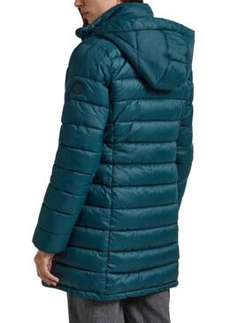 Giacca Pepe Jeans. Modello Meddie Long. Colore verde. Chiusura con cerniera. Con felpa con cappuccio. Collo lungo. Tessuto trapuntato. Patch gomma sul braccio. Cappuccio regolabile.