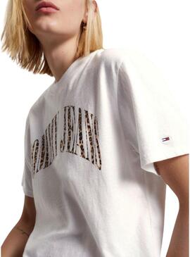 T-Shirt Tommy Jeans. Girocollo. Manica corto. Colore bianco. Logo con stampa leopardata sul petto. Regular fit. Patch logo Tommy Jeans sulla manica. La modella indossa la taglia S.