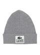 CappelloLacoste. Colore verde. Tessuto di lana a coste. Basso con giro. Con toppa in tessuto su parte anteriore. Ribete con logo.