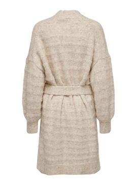 Cardigan Only. Celina modello Life. Colore beige. Spalle cadute. Scollo a V. Chiusura con cintura. 3/4 di lunghezza. Tessuto in maglia elasticizzata. Estremità elastiche. La modella indossa la taglia S.