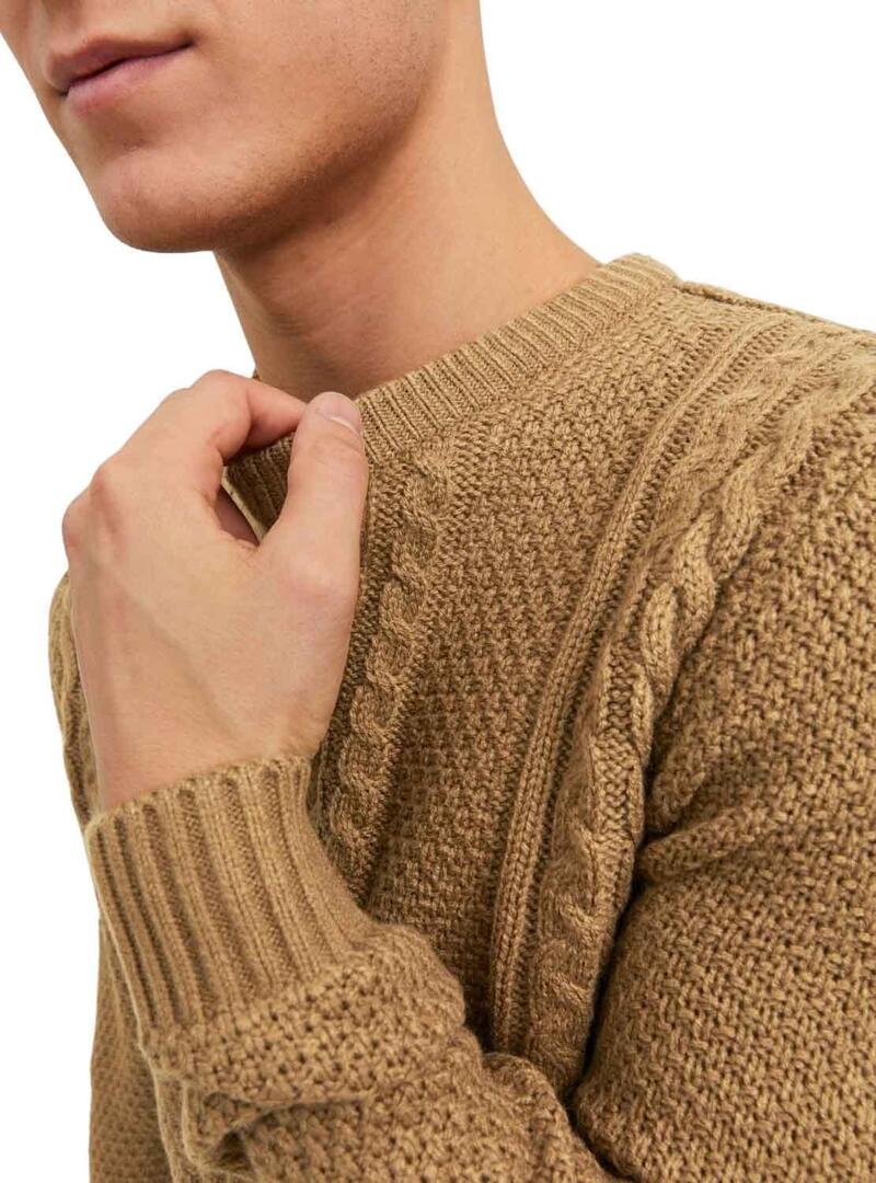 Pullover Jack & Jones. Modello Craig Knit. Colore tostato. Manica lungo. Girocollo. Tessuto in maglia effetto treccia. Estremità a coste.