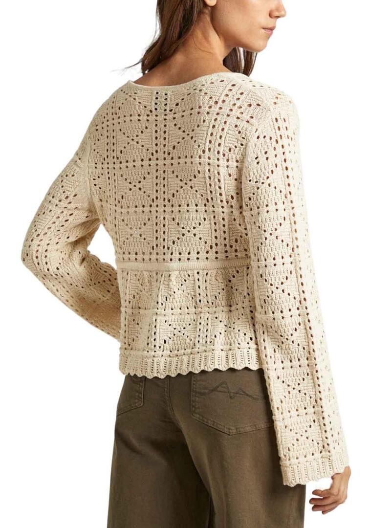 Pullover Pepe Jeans. Girocollo. Manica lungo. Colore beige. Chiusura con bottoni sul davanti. Dettagli traforati. Estremità ondulate. Vita regolabile con lacci. La modella indossa la taglia S.