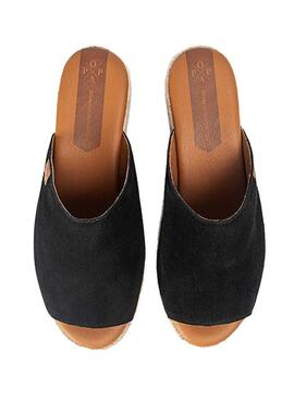 Ciabatte Popa. Modello Arenita. Colore nero. Punta aperta. Altezza del tacco 8 cm. Altezza anteriore 3,5 cm. Suola imbottita in pelle vegana. Parte superiore in camoscio. Zeppa di juta.