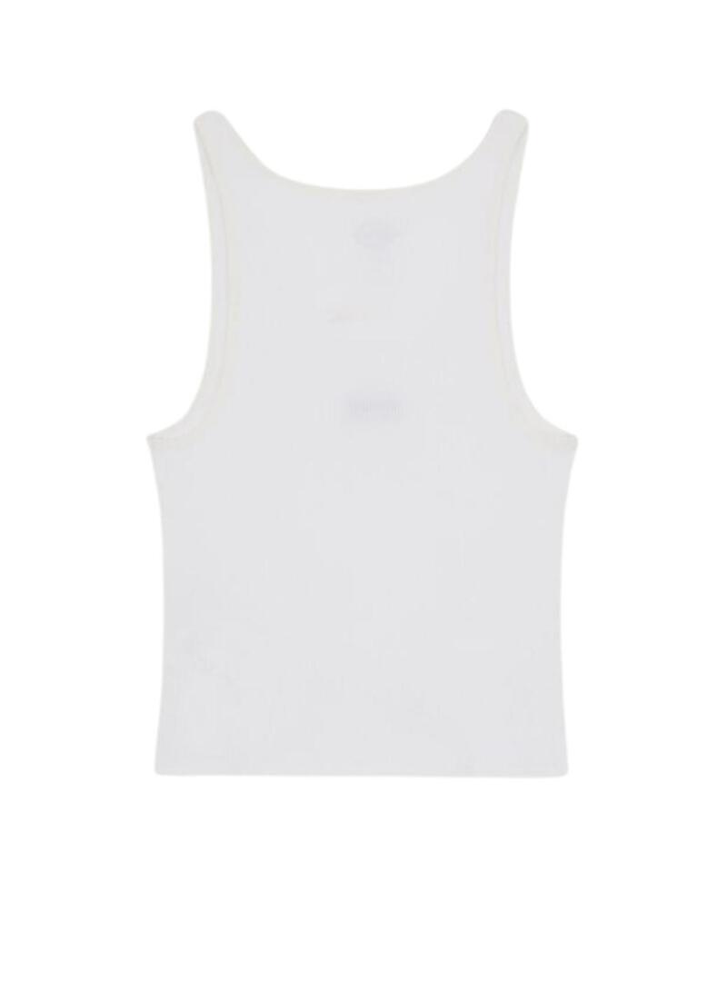 Maglietta Dickies. Modello Yorktown Vest. Colore bianco. Ampio collo rotondo. Tessuto elastico a coste in cotone. Taglio aderente favorevole. Logo scritto. Vestibilità aderente. Stile corto. La modella indossa la taglia S.