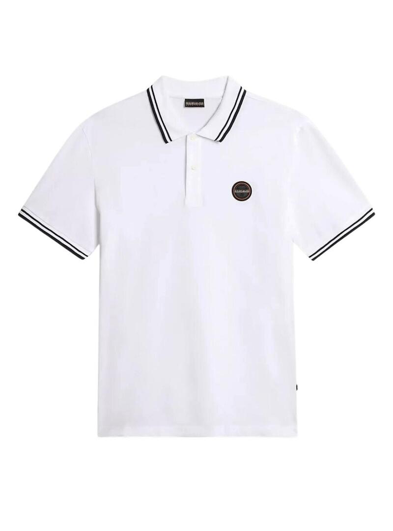 Polo a manica corta Napapijri. Colore bianco. Dettagli a contrasto. Modello E-Macas. Chiusura con bottoni. Patch sul petto. Vestibilità regolare. Il modello indossa la taglia L. Realizzato in cotone. Orli a maglia.