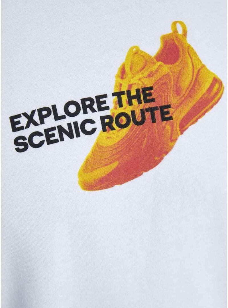 Felpa Jack and Jones. Modello Coedition. Colore bianco. Collo rotondo. Manica lunga. Orli elastici. Vestibilità regolare. Messaggio stampato sul petto con illustrazione di una scarpa. Dettagli in nero e arancione.