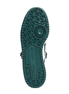 Scarpe Adidas. Modello Forum Low. Colore bianco con dettagli in verde. Parte superiore in pelle. Chiusura con lacci e striscia in velcro regolabile. Fodera interna in tessuto. Suola in gomma. Realizzate con il 50% di materiali riciclati. Dettaglio delle 3 strisce sul lato.
