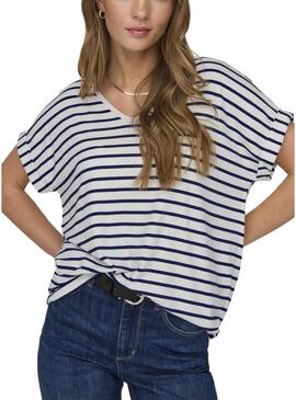 Maglietta Only. Modello Moster. Collo a V. Stampato a righe. Colore blu navy e bianco. Taglio oversize. Maniche con orlo. Tessuto in cotone organico.