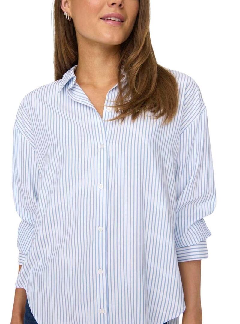 Camicia Only. Modello Alice. Colore blu. Colletto da camicia. Chiusura frontale con bottoni. Stampato a righe. Taglio regolare.