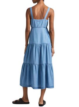 Abito Pepe Jeans. Modello Edith. Colore blu. Scollo con bottoni. Fondo con volant. Taglio midi. Tessuto leggero. Stile corsetto. Senza maniche.