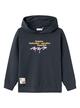 Felpa Name It. Modello Brosan. Colore blu scuro (inchiostro d'India). Manica lunga. Orli elastici. Con cappuccio fisso. Etichetta in basso. Testo stampato sul petto. Tessuto sportivo. Stampa 3D sul retro. Vestibilità regolare. Tessuto morbido.