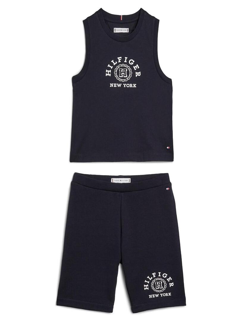Conjunto Tommy Hilfiger. Colore blu scuro. Canottiera. Scollo rotondo. Logo dello stemma Archive di Tommy Hilfiger sul petto. Taglio ampio. Pantaloncini corti. Aderenti. Logo dello stemma Archive di Tommy Hilfiger sulla gamba.