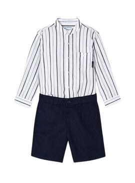 Set Mayoral. 2 pezzi. Da vestire. Camicia a maniche lunghe. Stampato a righe. Colletto mao. Tasca sul petto con bottone. Manica lunga. Bermuda colore blu scuro. Tessuto in lino. Con pinces. Tasche laterali. Una tasca posteriore.