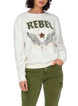 Felpa Only. Modello Layla. Colore beige. Collo rotondo. Orli a costine. Illustrazione stampata sul petto. Dettagli in dorato e verde. Vestibilità regolare. Ispirazione militare.