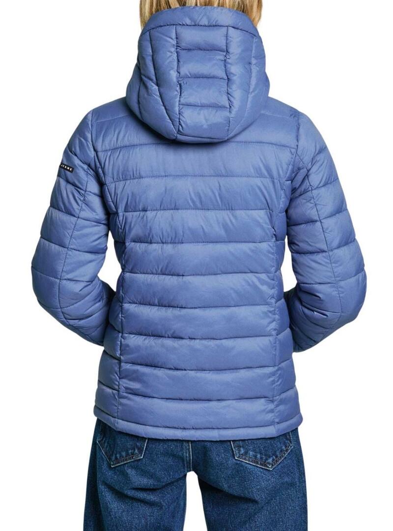 Giacca Pepe Jeans. Modello Ammy short. Colore blu. Tessuto trapuntato. Chiusura con zip. Collo alto con cappuccio. Tessuto resistente all'acqua. Taglio leggermente aderente in vita. Tasche laterali con zip. Logo sulla manica.