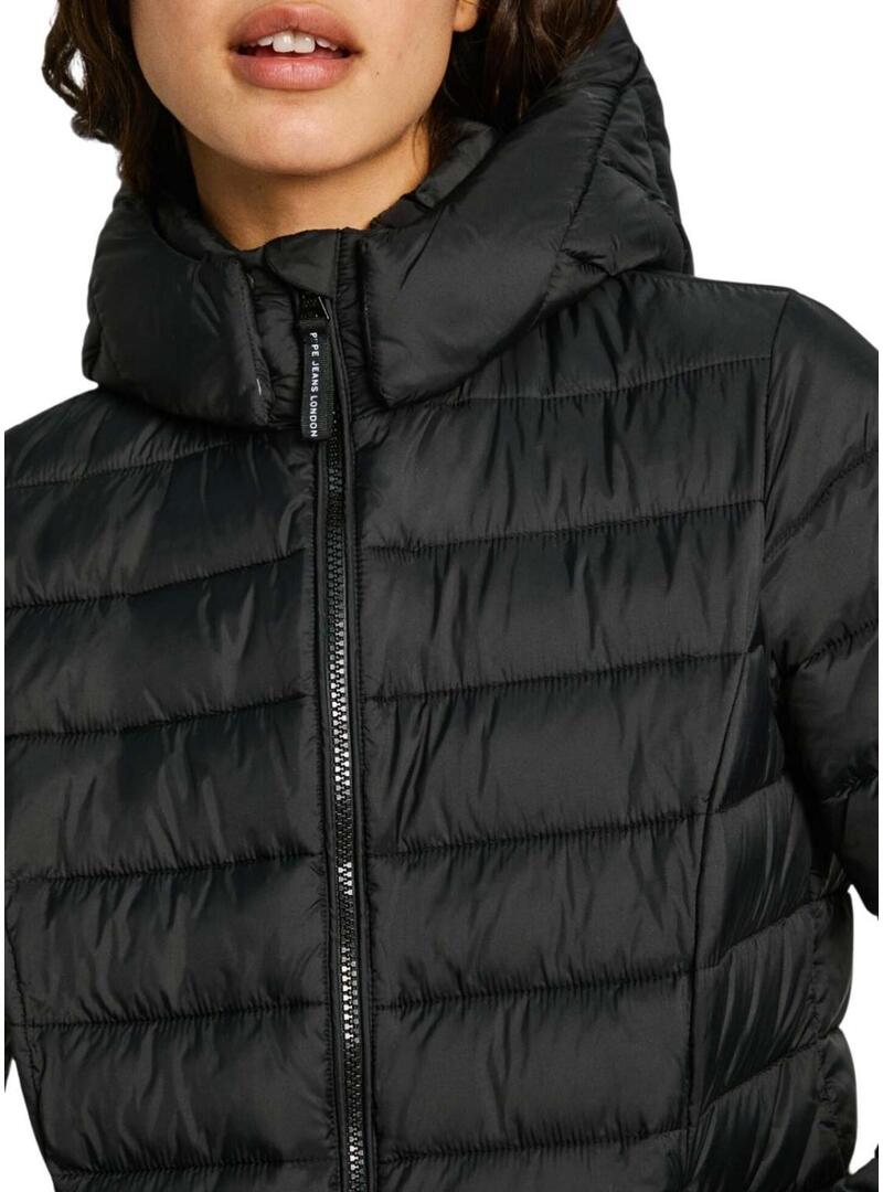 Giacca Pepe Jeans. Modello Ammy short. Colore nero. Tessuto trapuntato. Chiusura con zip. Maniglia personalizzata con il marchio. Colletto alto con cappuccio. Tessuto resistente all'acqua. Taglio leggermente aderente in vita. Tasche laterali con zip. Logo sulla manica.