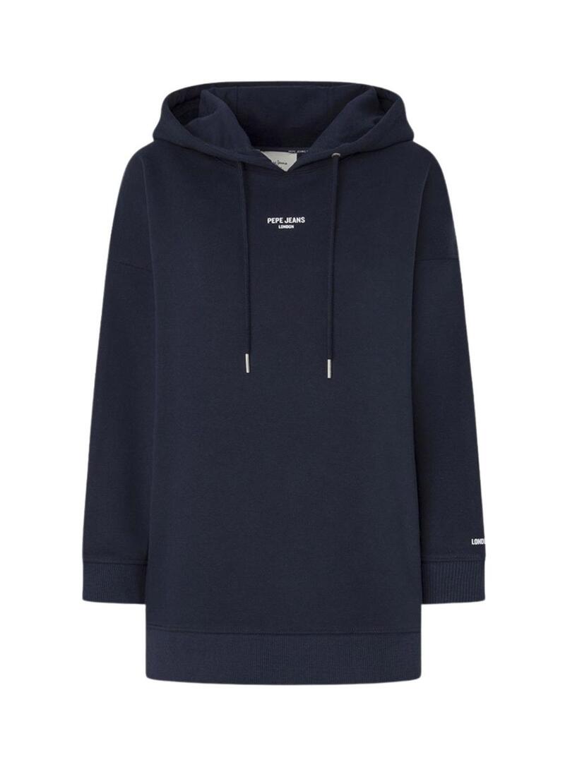 Felpa Pepe Jeans. Modello Fergie. Taglio lungo. Colore blu scuro. Vestibilità regolare. Logo stampato sul petto. Polsini a costine. Taglia XL stampata sulla schiena. Dettagli in bianco. Cappuccio con coulisse regolabile.