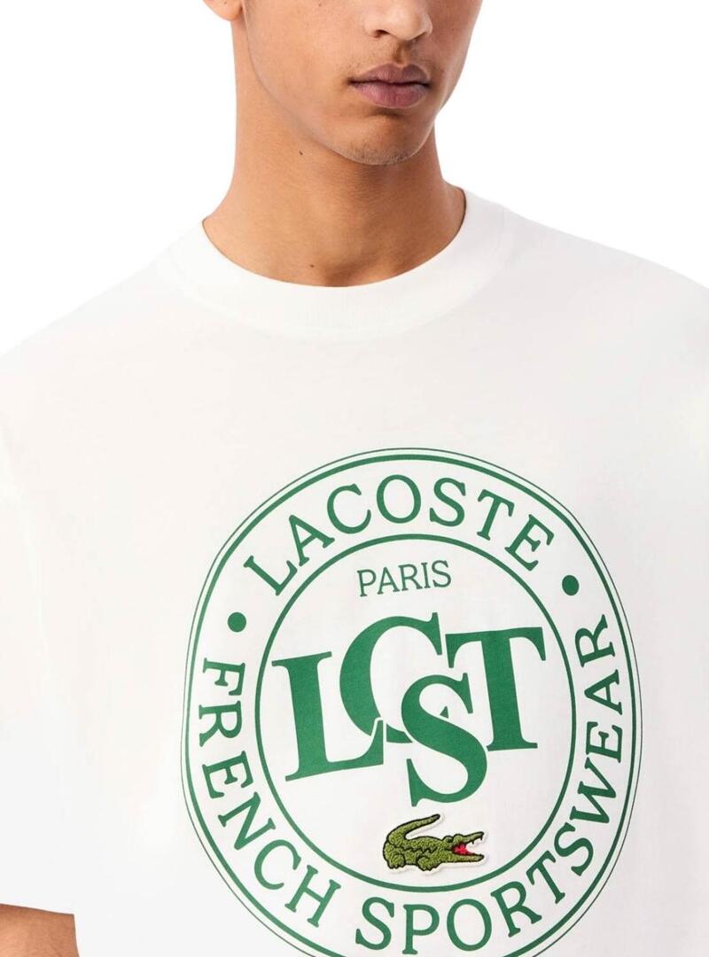 Maglietta Lacoste. Modello LCST. Colore bianco. Collo rotondo. Vestibilità ampia. Manica corta. Logo stampato sul davanti in forma circolare. Dettagli in verde.