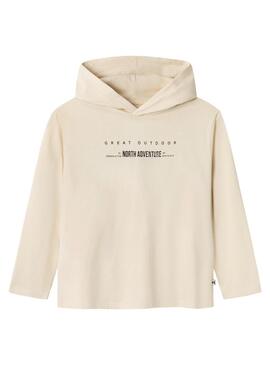 Felpa Name It. Modello Odiska. Felpa dal taglio regolare. Colore sabbia. Silhouette diritta. Lunghezza classica. Manica lunga. Design sul petto con il testo Great Outdoor. Grafica di una montagna sul retro. Include cappuccio.