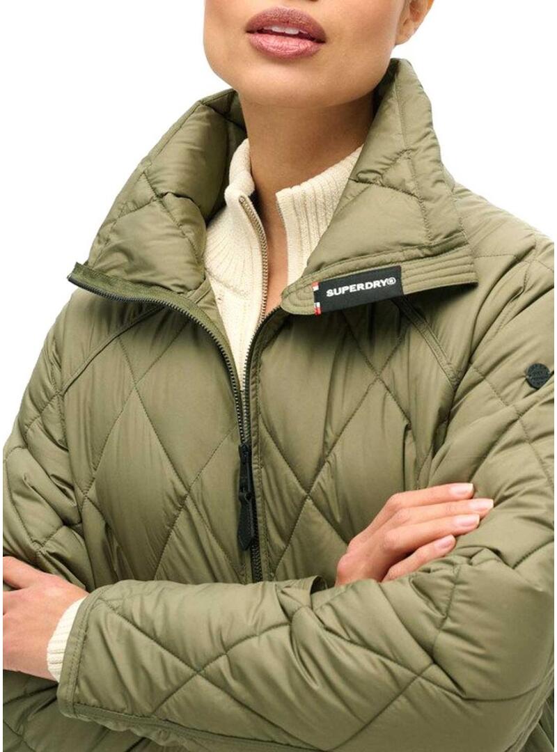Giubbotto Superdry. Colore verde. Imbottito. Extra lungo a rombi. Taglio rilassato. Colletto alto. Chiusura anteriore con zip doppia. Due tasche con bottoni. Etichetta di tessuto distintiva sul retro del collo. Etichetta distintiva in metallo sulla manica.
