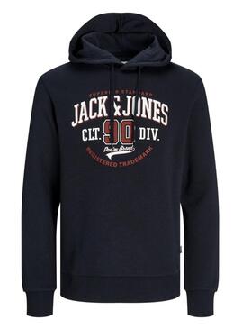 Felpa Jack and Jones. Modello Jelogo. Cappuccio con coulisse regolabile. Colore blu scuro. Logo stampato sul petto. Dettagli in rosso e bianco. Orli a costine.