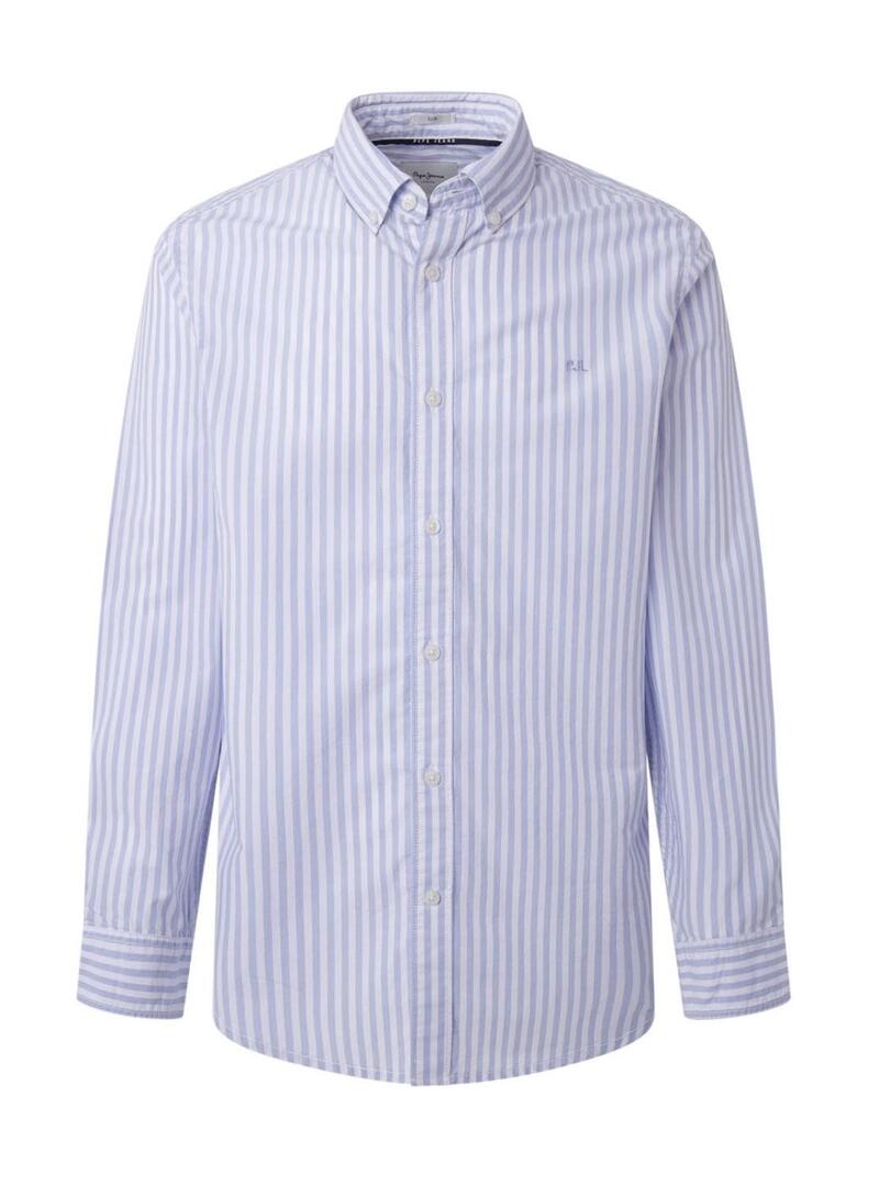 Camicia Pepe Jeans. Colore blu. Stampato a righe. Tessuto popeline di cotone. Fit slim. Manica lunga. Colletto con bottoni. Monogramma PJL ricamato tono su tono sul petto. Il modello indossa la taglia M.