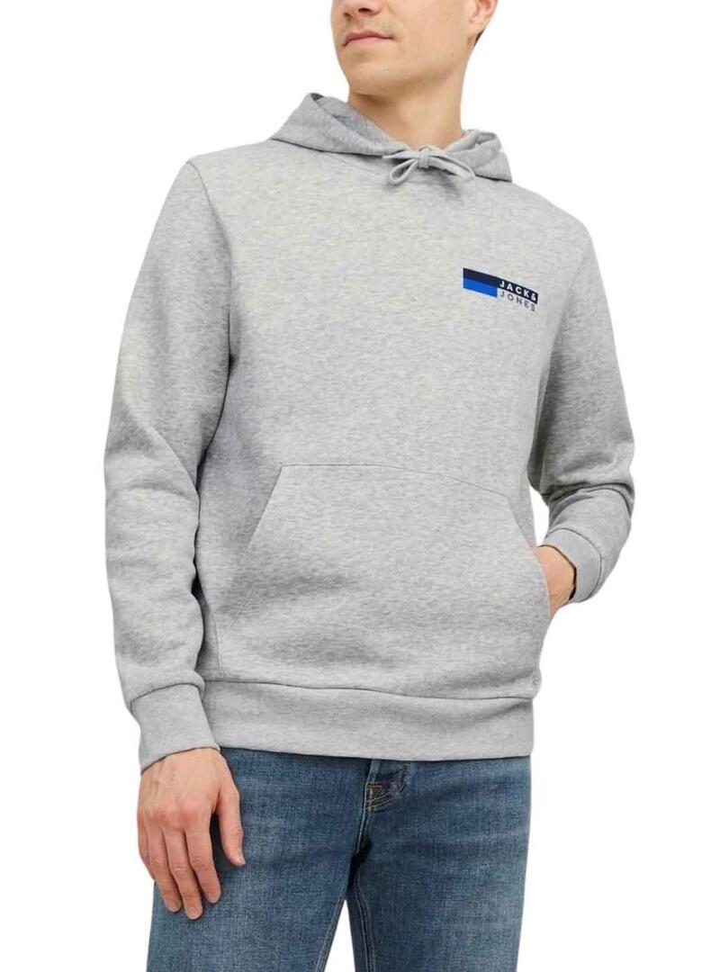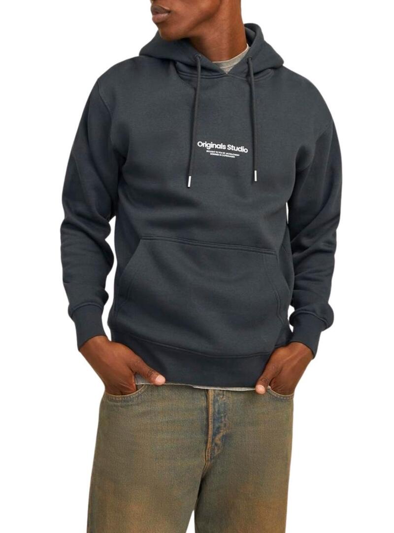 Felpa Jack and Jones. Modello Verner. Colore blu scuro. Orli a costine. Vestibilità regolare. Logo stampato sul petto in bianco. Cappuccio con laccetti regolabili.