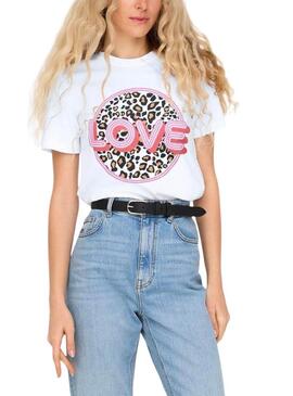 Maglietta Only. Modello Lariya. Colore bianco. Manica corta. Collo rotondo. Vestibilità regolare. Messaggio 'LOVE' stampato in rosa con animalier.