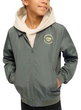 Giacca bomber. Marca Jack and Jones. Modello Zack. Colore verde. Collo e polsini a costine. Tasche laterali. Tessuto leggero. Chiusura con zip. Logo circolare stampato sul petto.