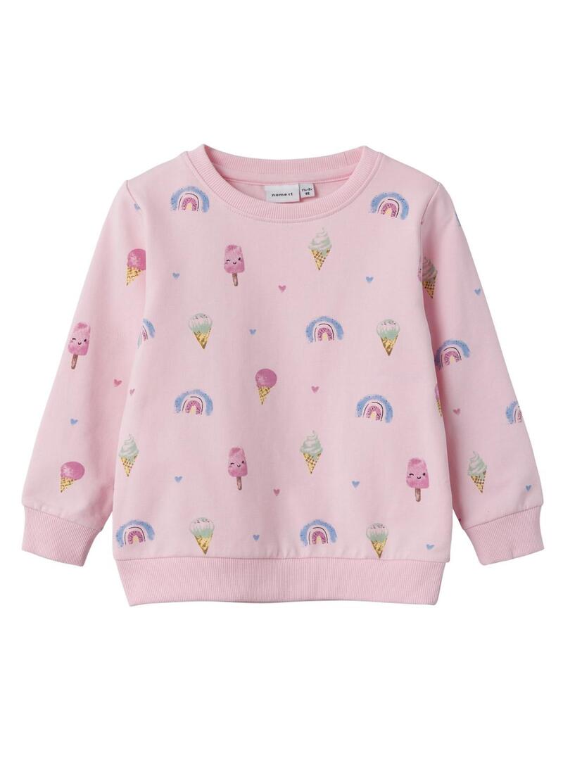 Felpa Name It. Modello Bukak. Colore grigio. Tessuto mélange. Collo rotondo. Manica lunga. Orli a costine. Messaggio con illustrazione di fragole stampato sul petto. Spalle cadenti. Vestibilità ampia.