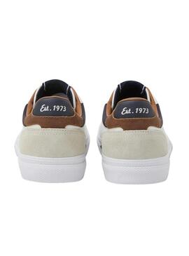 Scarpe Pepe Jeans. Modello Kenton Court. Colore bianco. Logo laterale. Silhouette basic. Suola in gomma. Chiusura con lacci. Pannelli in camoscio grigio. Tallone con marchio in blu navy e marrone.