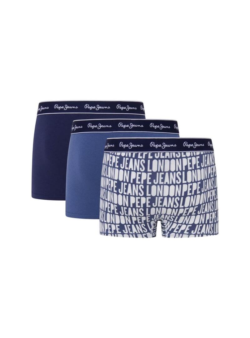 Scatola di boxer Pepe Jeans. Modello Solid. Vestibilità slip. Colore blu scuro, blu chiaro e grigio. Vita elastica con logo.
