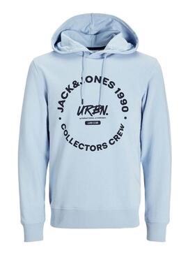 Felpa Jack and Jones. Modello Simon. Colore blu. Manica lunga. Stampa grafica sulla parte anteriore. Cappuccio regolabile con cordoncino. Taglio regolare.