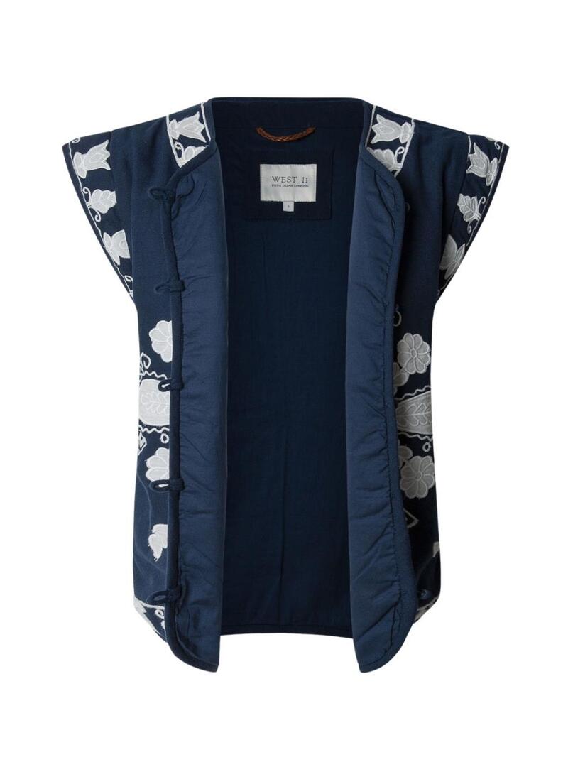 Gilet Pepe Jeans. Modello Heaven. Colore blu scuro. Chiusura con bottoni. Con spalline. Colletto rotondo. Leggermente imbottito. Tessuto ricamato con motivi etnici a contrasto.
