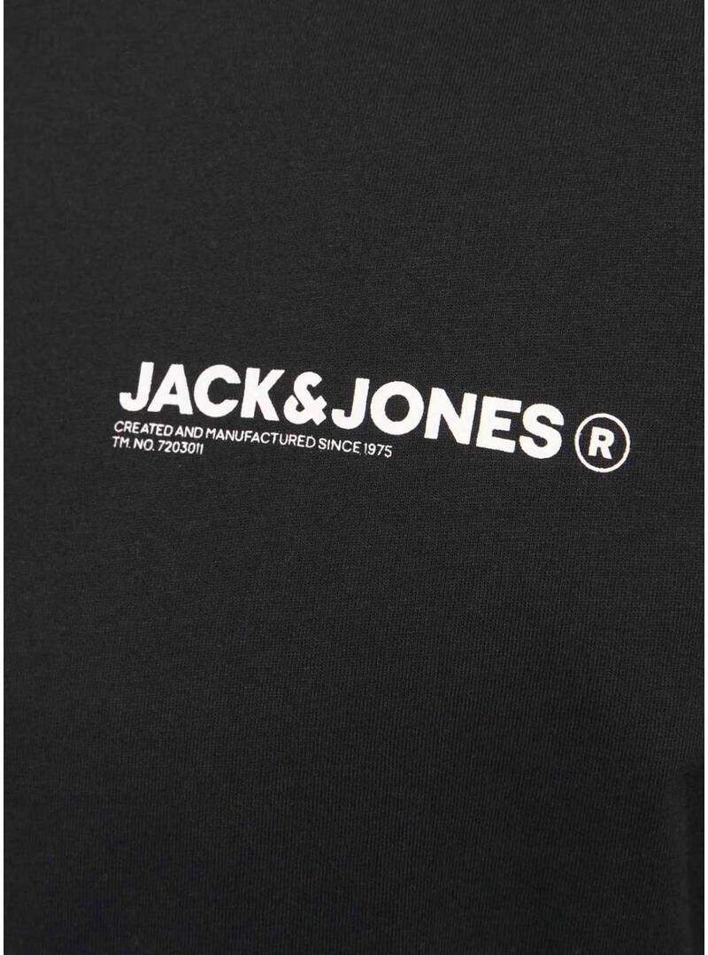 Maglietta Jack and Jones. Modello Hawaii. Colore nero. Manica corta. Collo rotondo. Logo del marchio sul petto. Stampa sulla schiena. Vestibilità ampia.