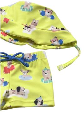Set Mayoral da bagno. 3 pezzi con protezione solare. Maglietta bianca. Maniche corte. Collo rotondo. Stampa sul davanti. Costume da bagno stampato color giallo. Vita elasticizzata regolabile con coulisse. Cappello stampato.