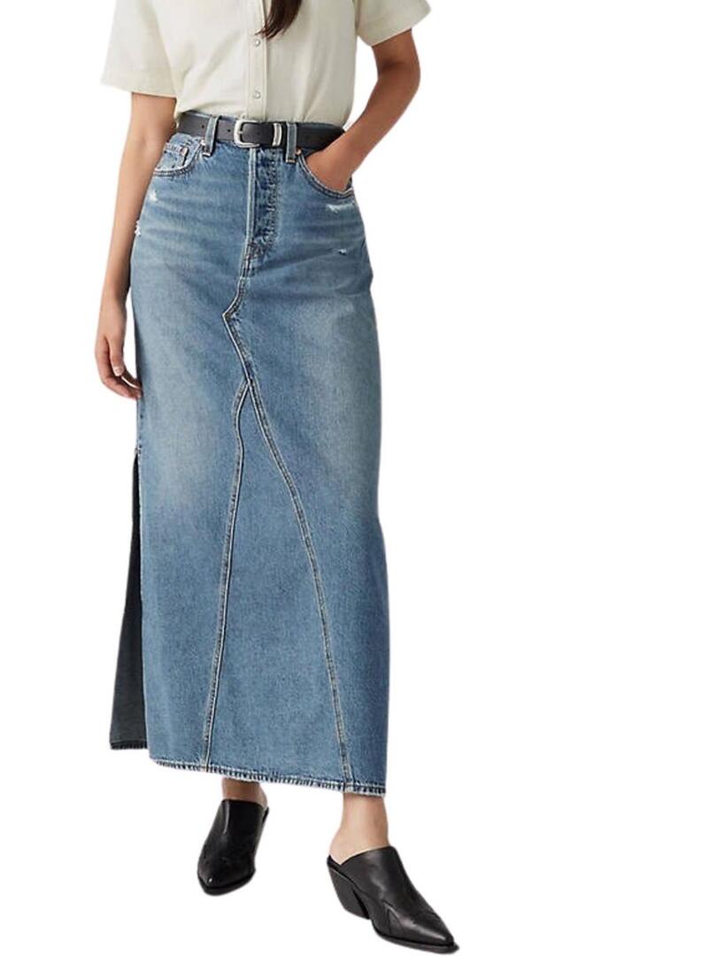 Gonna in denim Levi's. Modello Iconic. Colore blu. Taglio a A. Chiusura con bottone e zip. Passanti per cintura. Lunghezza della gamba: 122 cm, misurata sulla taglia 27 di vita. Tessuto non elastico. Design a cinque tasche. Tasche posteriori uguali a quelle dei jeans 501. Cavallo medio. Dettagli iconici di Levi's.