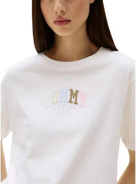 Maglietta Tommy Jeans. Modello Color Varsity. Colore beige. Manica corta. Collo rotondo. Vestibilità oversize. Logo stampato sul petto in tonalità pastello.