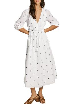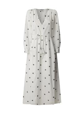 Abito Pepe Jeans. Modello Deal. Colore bianco. Ricamato con motivo etnico in blu scuro. Scollo a V. Manica lunga con leggero volume. Vita regolabile con coulisse. Lunghezza midi.